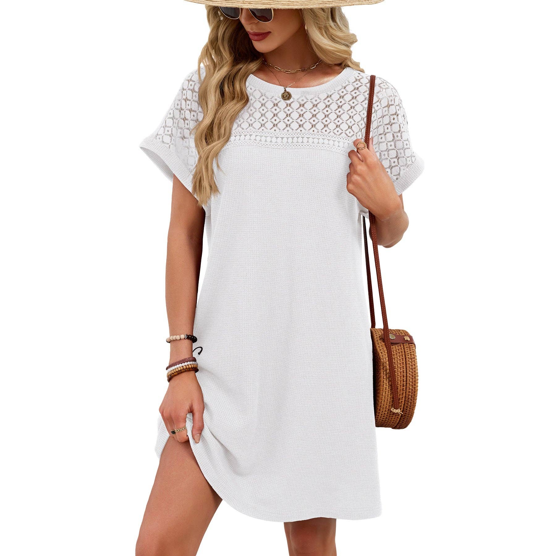• Elegant Lace Patchwork Detail – Designed with a delicate lace panel at the neckline and sleeves, this dress adds a feminine touch while staying simple and versatile. The solid-color finish makes it an easy staple for spring and summer boutiques.